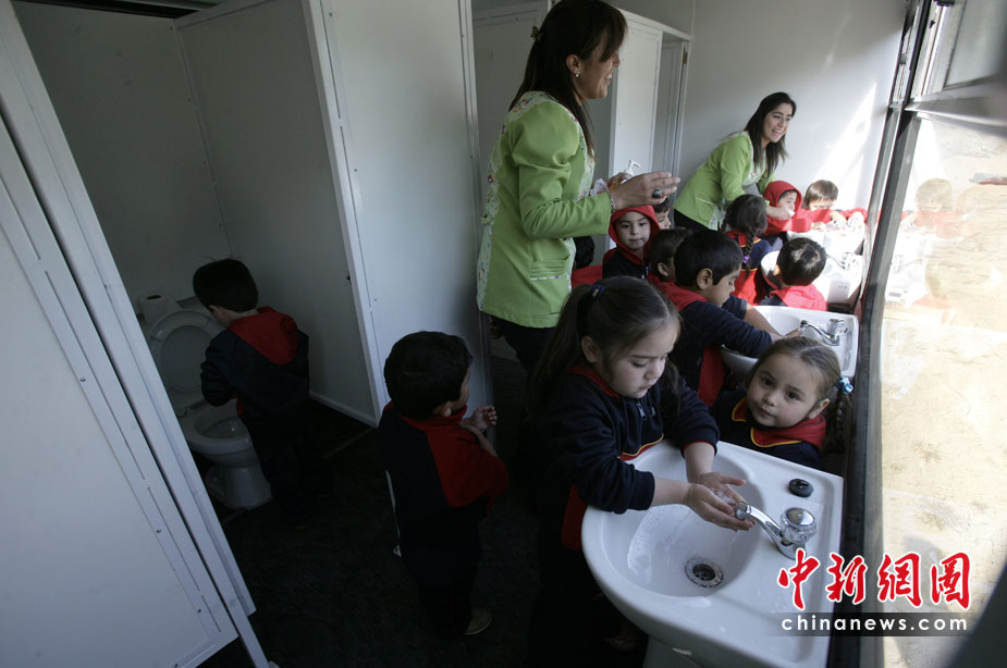 4月26日,今年2月遭受8.8級強烈地震的智利康塞普西翁市,兒童們在“巴士學校”里上課。