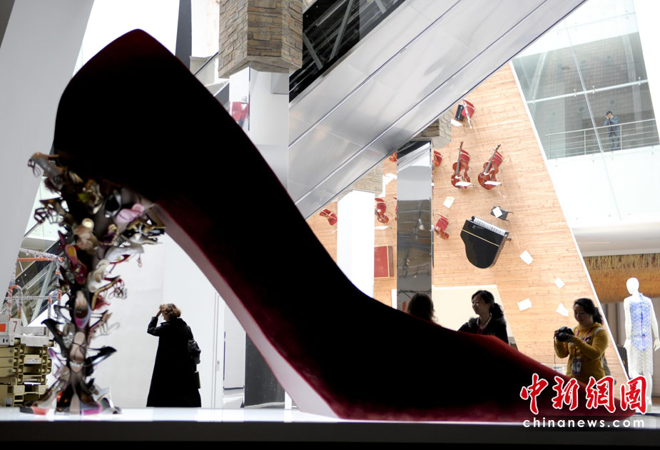 4月27日,一位外國(guó)女士走過(guò)上海世博園意大利館內(nèi)的高跟鞋展品。中新社發(fā) 廖攀 攝