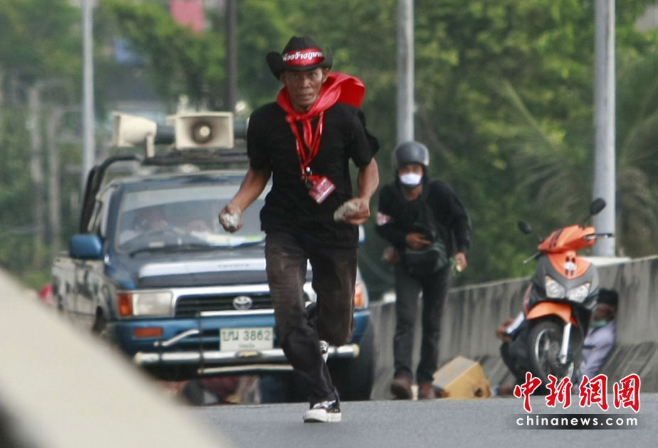 泰國(guó)防暴警察與紅衫軍示威民眾28日下午爆發(fā)沖突,1名士兵頭部被擊中身受重傷,10名示威民眾受傷送醫(yī)。
