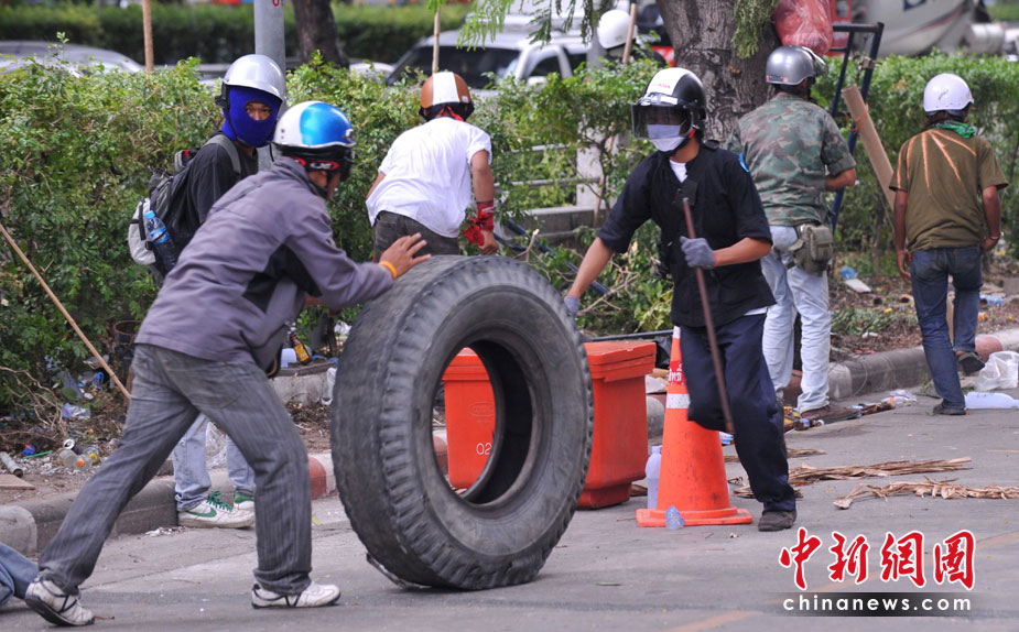 泰國防暴警察與紅衫軍示威民眾28日下午爆發沖突,1名士兵頭部被擊中身受重傷,10名示威民眾受傷送醫。