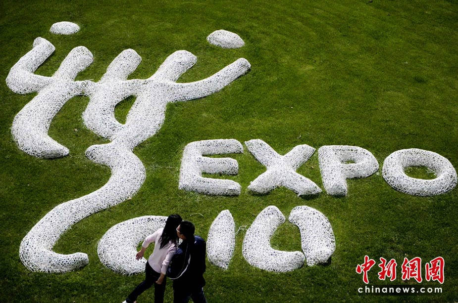 4月29日,上海靜安區草坪上的世博會會徽和一對情侶。世博會開幕前,面臨“大考”的上海充滿喜慶氣氛。 中新社發 廖攀 攝