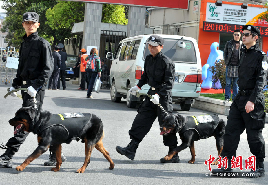 4月30日晚,舉世矚目的上海世博會開幕式將在黃浦江畔世博園區舉行。 4月30日上午,上海警察攜警犬在世博園周圍巡邏。中新社發 賈國榮 攝