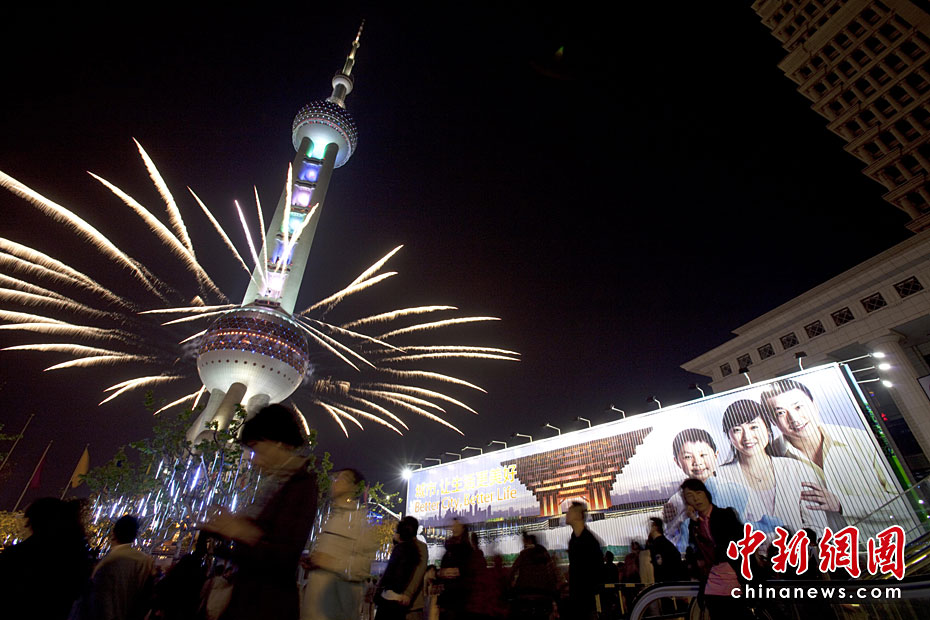 4月30日晚,2010年上海世博會開幕式在上海世博園世博文化中心舉行。21時28分,世博會焰火燈光表演開始。黃浦江兩岸綿延3.28公里同時奏響火樹銀花不夜天的華彩世博樂章。圖片來源:中國新聞網