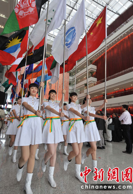 5月1日,上海世博會舉行開園儀式,美女旗手高舉參展國家和地區、組織的旗幟入場。中新社發 賈國榮 攝