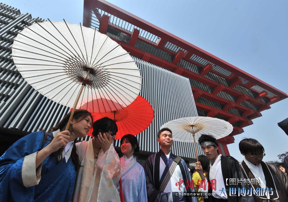 5月1日,上海世博會正式開園,當(dāng)日有20萬人次的游客參觀了世博園。世博首日,許許多多的小細(xì)節(jié)都帶給人一種全新的體驗(yàn)。圖為大學(xué)生身著古裝游覽中國館。中新社發(fā) 賈國榮 攝