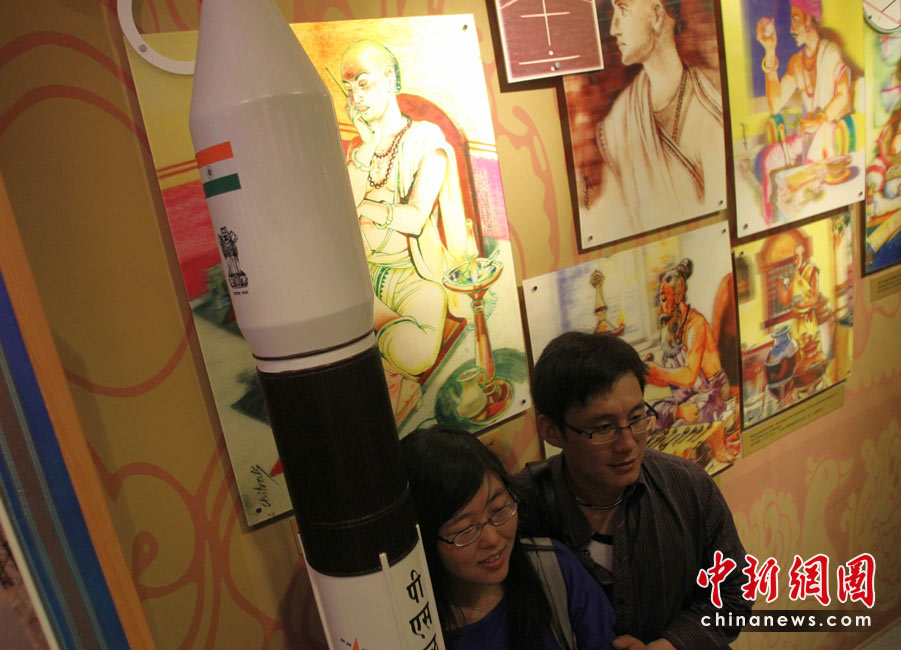 5月2日,觀眾在上海世博會印度館參觀印度的“一箭十星”火箭模型。中新社發 蘇丹 攝