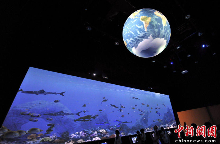 “人與海洋的和諧共存”是2012年麗水世博會的口號,在該展區,游客可以通過電腦屏幕設計一條電子魚,然后“放生”到大屏幕組成的“海洋”中進行水質監測,這些互動內容都引發游客極大的興趣。中新網記者 王紅綱 攝