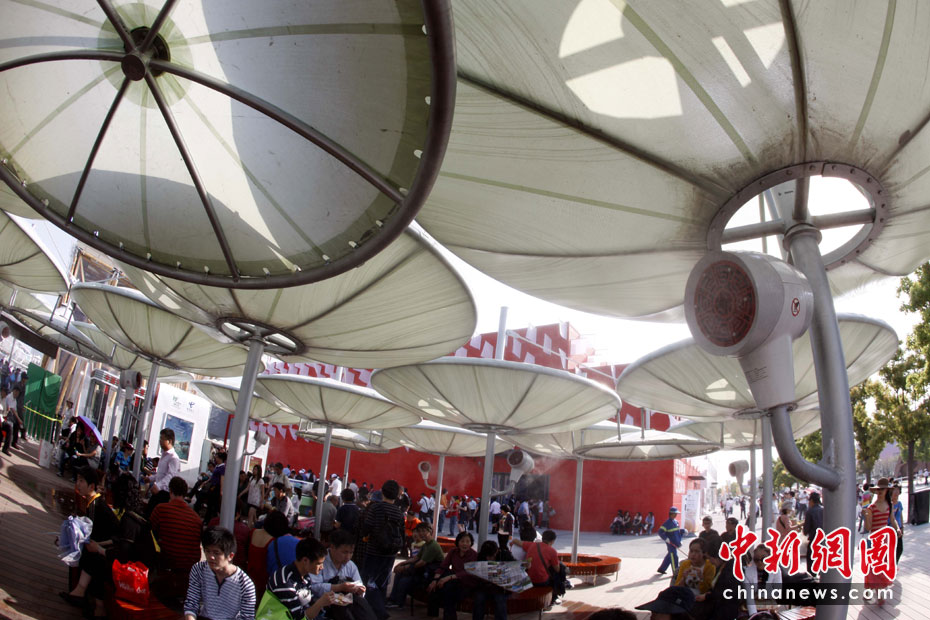 2010年5月2日,上海世博園區啟動各項控溫降溫設施應對高溫。圖為游客休息區內啟動噴霧降溫系統。中新社記者 盛佳鵬 攝