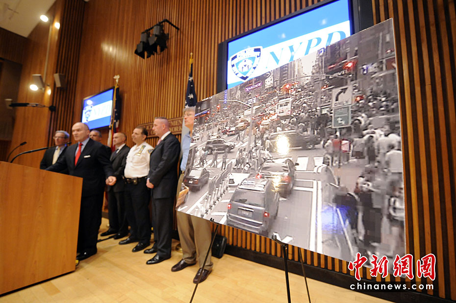 美國當(dāng)?shù)貢r間5月2日,紐約市警察局長凱利在記者會上公布了紐約時代廣場爆炸事件現(xiàn)場照片。同時他還指出,沒有證據(jù)顯示巴基斯坦塔利班策劃了1日傍晚發(fā)生在紐約時報廣場上的未遂汽車炸彈襲擊事件。圖片來源:中國新聞網(wǎng)