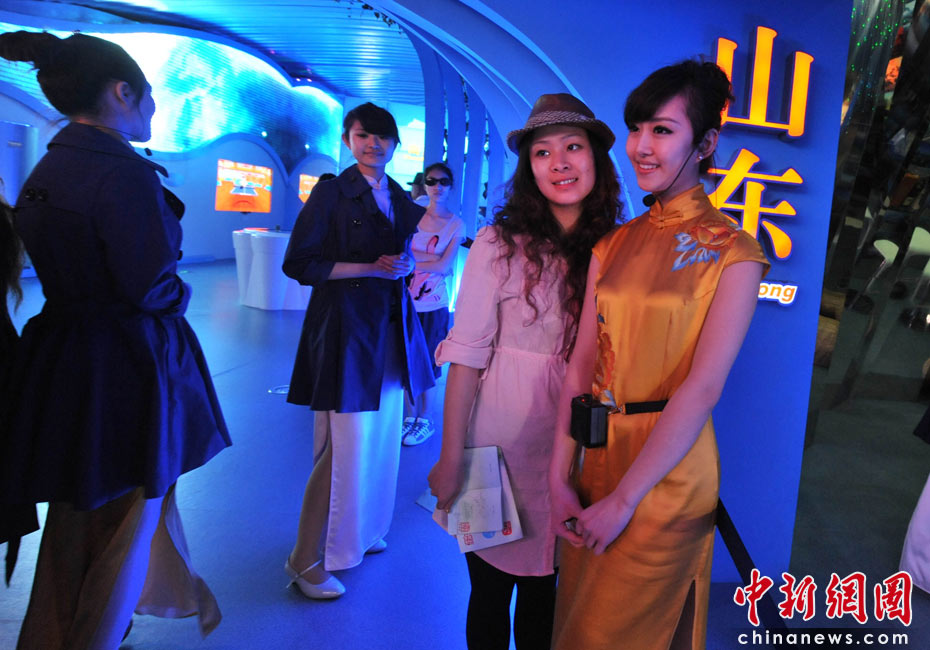 5月3日,上海世博會中國山東館一位禮儀小姐始終笑容可掬,許多參觀者都喜歡與外秀內慧的她拍一張留影照。當一對夫婦推著嬰兒車經過時,她迅速上前幫助抬下階梯。她因而享有全場最善解人意的禮儀小姐美稱。中新社發 賈國榮 攝
