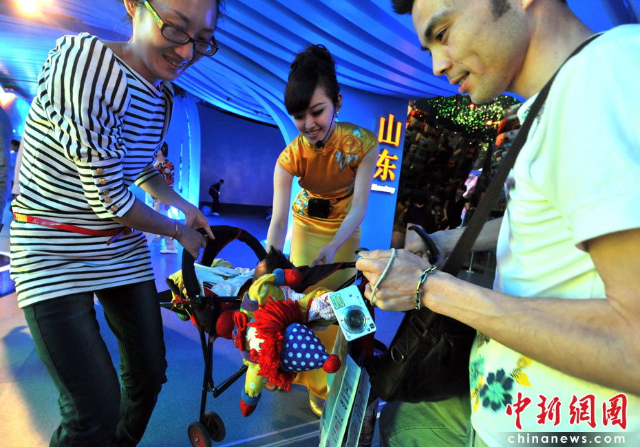 5月3日,上海世博會中國山東館一位禮儀小姐始終笑容可掬,許多參觀者都喜歡與外秀內慧的她拍一張留影照。當一對夫婦推著嬰兒車經過時,她迅速上前幫助抬下階梯。她因而享有全場最善解人意的禮儀小姐美稱。中新社發 賈國榮 攝