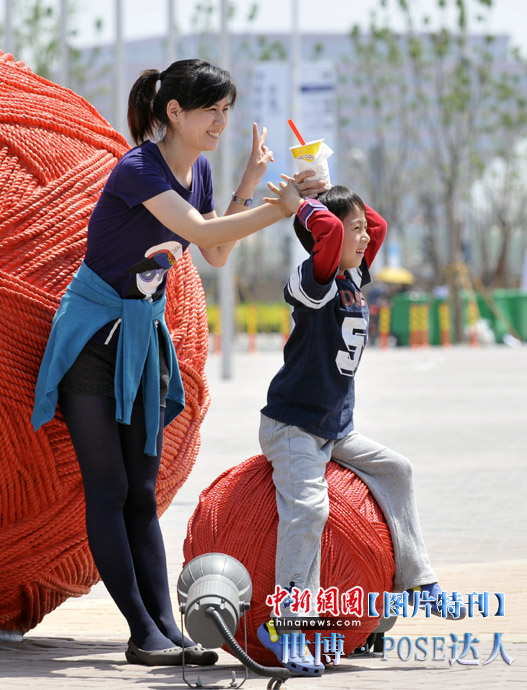 逛世博一定會拍照留念,擺一個漂亮有創意的pose尤為重要。面對著鏡頭,挺胸收腹翹臀,一個微笑,一個手勢,秀出自己的活力。心中一定要默念:“我留下的不是照片,是心情!”圖為一對母子擺出的愛心pose。中新網記者 王紅綱 攝