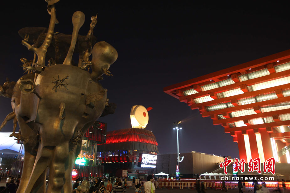 夜幕下的上海世博園區處處流露光華與璀璨,圖為中國館與一尊雕塑之間的澳門館。中新社發 宗金柱 攝