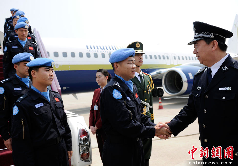 5月4日,中國第八支赴海地維和警察防暴隊全體隊員乘坐聯合國包機返回祖國。公安部副部長孟宏偉、政治部主任蔡安季前往機場迎接。 中新社發 劉震 攝