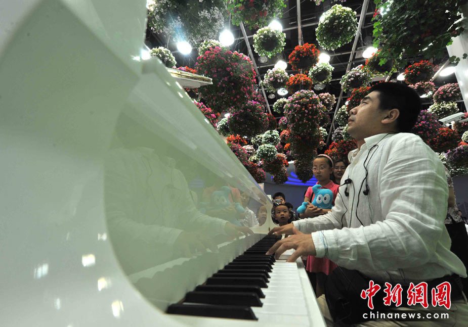 5月4日是上海世博會第四天,盲人鋼琴家孫巖在生命陽光館專設區域為眾多殘疾人和觀眾演奏,導盲犬靜臥在他的腳邊,這是世博會歷史上第一次為殘疾人設館。孫巖2005年獲得“日本橫濱第一屆國際殘疾人鋼琴比賽”金獎,他是中央音樂學院有史以來第一位盲人大學生和研究生。他的傾情演奏感動全場,掌聲連連。中新社發 賈國榮 攝
