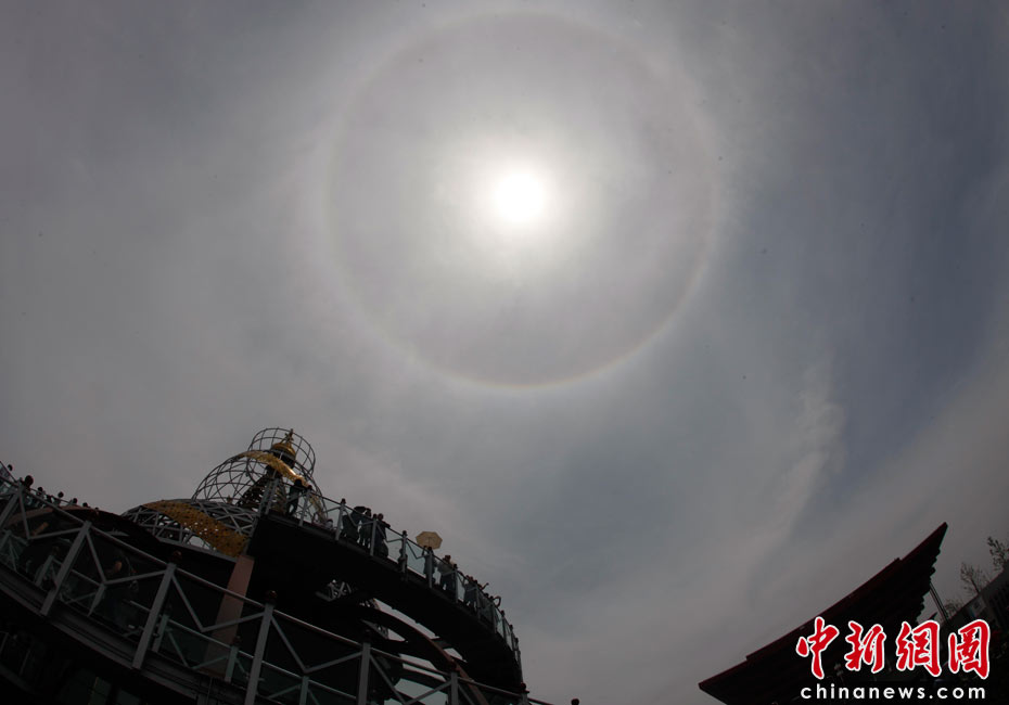 2010年5月4日,上海世博園區上空出現日暈,與中國國家館和尼泊爾館相映成趣。中新社發 盛佳鵬 攝
