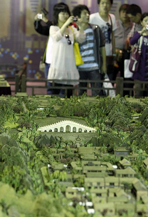 5月4日,游客在參觀縮微版“圓明園”。近日,一座“全景式巨型立雕圓明園”在上海世博會世界貿易中心協會館亮相。這座縮微版的“圓明園”以1比150的比例制作而成,再現了全盛時期的圓明園雄偉壯觀的全景。圖片來源:新華網 裴鑫 攝