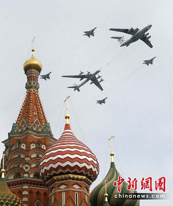 當?shù)貢r間5月4日,在俄羅斯首都莫斯科,參加彩排的戰(zhàn)機編隊飛過紅場上空。俄羅斯將于5月9日隆重紀念衛(wèi)國戰(zhàn)爭勝利65周年。圖片來源:中國新聞網(wǎng)