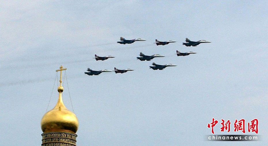 當(dāng)?shù)貢r(shí)間5月4日,在俄羅斯首都莫斯科,參加彩排的戰(zhàn)機(jī)編隊(duì)飛過(guò)紅場(chǎng)上空。俄羅斯將于5月9日隆重紀(jì)念衛(wèi)國(guó)戰(zhàn)爭(zhēng)勝利65周年。圖片來(lái)源:中國(guó)新聞網(wǎng)