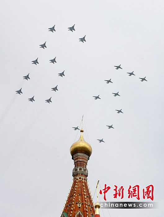 當地時間5月4日,在俄羅斯首都莫斯科,參加彩排的戰機編隊飛過紅場上空。俄羅斯將于5月9日隆重紀念衛國戰爭勝利65周年。圖片來源:中國新聞網