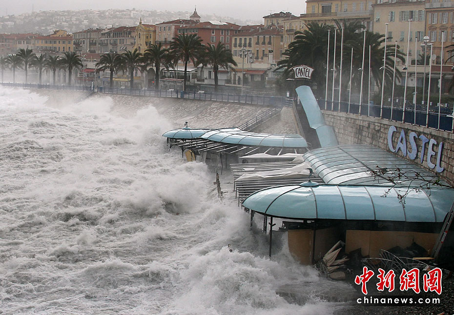 近日,在法國南部城市尼斯,巨浪襲擊城市的海岸后造成城市道路癱瘓。法國南部部分地區遭遇大風和巨浪,使當地交通和供電受到不同程度的影響。圖片來源:中國新聞網