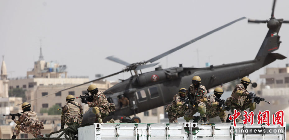 5月11日,約旦特種部隊(duì)在安曼空軍基地附近舉行演習(xí),為特種作戰(zhàn)部隊(duì)展覽會(huì)(SOFEX)開(kāi)幕式助興。該展覽會(huì)為期4天,展覽主題包括國(guó)家安全及反恐措施。圖片來(lái)源:中國(guó)新聞網(wǎng)