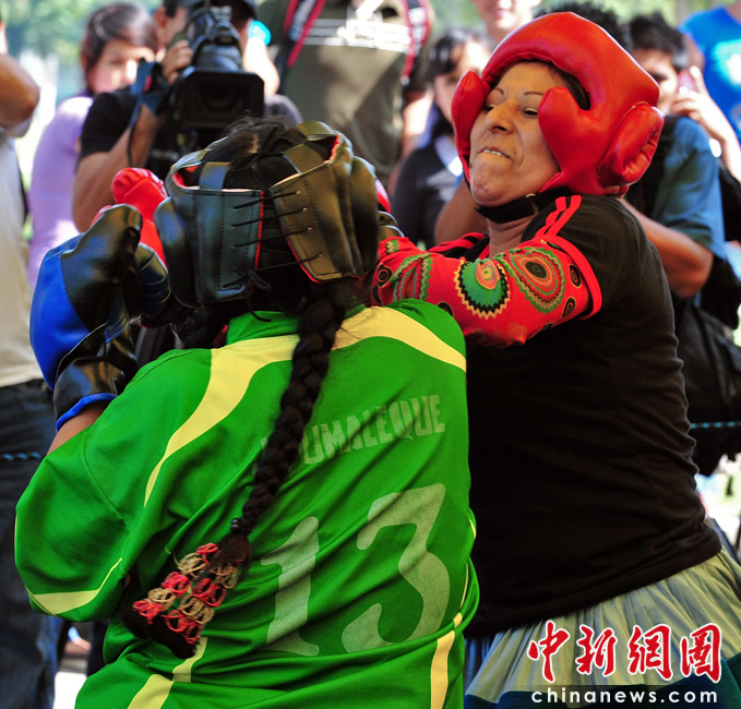 5月13日,秘魯利馬高地舉辦的傳統(tǒng)食品博覽會上,兩名安第斯農民婦女穿著象征秘魯和玻利維亞的裙子同臺搏擊妙趣橫生。圖片來源:中國新聞網