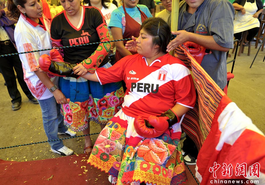 5月13日,秘魯利馬高地舉辦的傳統(tǒng)食品博覽會(huì)上,兩名安第斯農(nóng)民婦女穿著象征秘魯和玻利維亞的裙子同臺(tái)搏擊妙趣橫生。圖片來源:中國(guó)新聞網(wǎng)