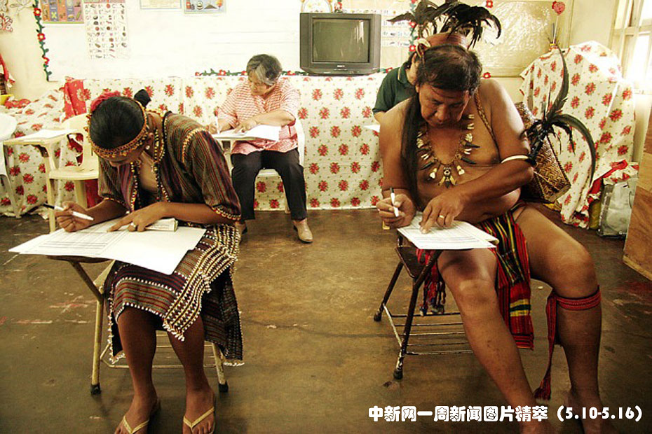 周一(10日),在菲律賓碧瑤市,身著傳統(tǒng)服裝的伊哥洛原住民老者尼古拉•卡沃德(Nicholas Cawed,右),和女兒米亞·尼古拉·卡沃德(Mia Nichole Cawed)填寫總統(tǒng)選票。
