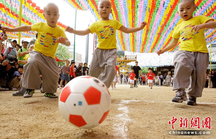 2010年5月15日,韓國(guó)首爾曹溪寺院舉行了兒童足球賽,一群四五歲的孩子和小和尚參加了這場(chǎng)足球友誼賽。這場(chǎng)比賽是佛誕節(jié)活動(dòng)的一部分,也是為了迎接2010世界杯足球賽的到來(lái)。Chung Sung-Jun