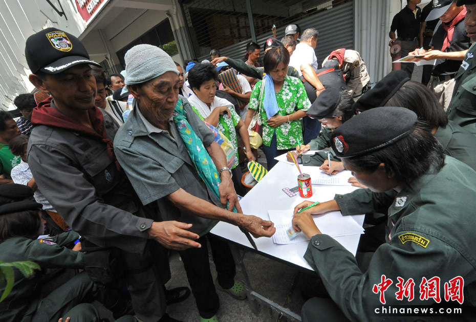 5月20日,數千名結束集會的外地“紅衫軍”示威者在曼谷拉差巴頌地區接受登記和安全檢查后,乘坐政府安排的車輛返回家鄉。