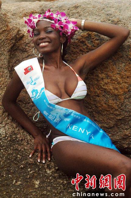 5月21日,海南三亞參加第35屆國際比基尼小姐全球總決賽的64位各國佳麗開始了她們在三亞為期9天的時尚美麗之旅。當日,佳麗們前往著名的天涯海角、大小洞天等景區,拍攝外景,體驗美麗的三亞熱帶風光,展現美麗風采。中新社記者 尹海明 攝