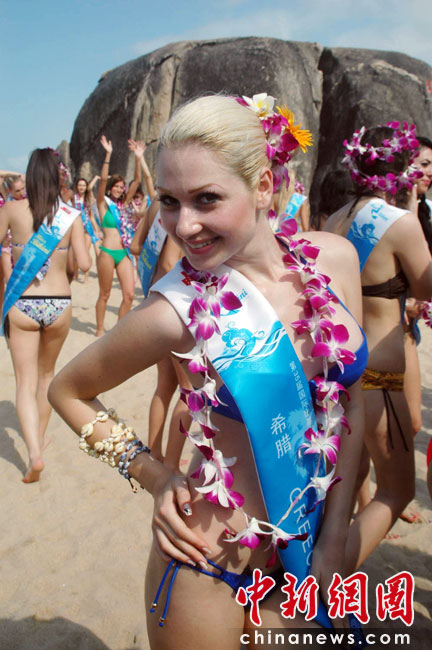 5月21日,海南三亞參加第35屆國際比基尼小姐全球總決賽的64位各國佳麗開始了她們在三亞為期9天的時尚美麗之旅。當日,佳麗們前往著名的天涯海角、大小洞天等景區,拍攝外景,體驗美麗的三亞熱帶風光,展現美麗風采。中新社記者 尹海明 攝