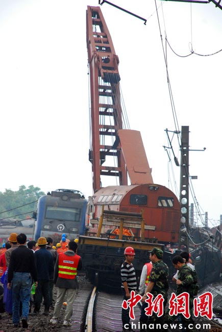 中新網東鄉5月23日電(艾永全 何柳斌 劉占昆)23日下午14時,距離滬昆鐵路客運列車脫線事發已經12小時,武警、消防、醫護、交警、特警仍在事故現場緊急救援。  劉占昆 攝