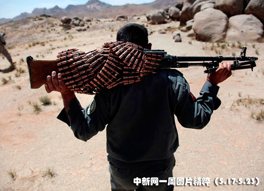 5月20日在阿富汗坎大哈,一名阿富汗國(guó)民警察扛著一挺機(jī)關(guān)槍和美國(guó)士兵一起巡邏。