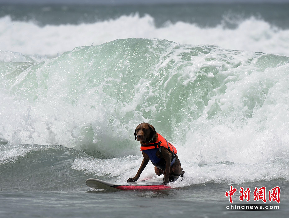 5月22日,美國加利福尼亞州圣迭戈舉行了一場妙趣橫生的狗狗沖浪比賽。圖片來源:中國新聞網