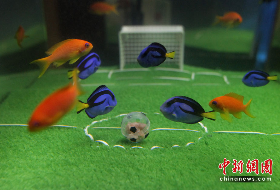 5月23日,日本橫濱八景島海洋世界水族館中,一群魚兒在“踢足球”,藍(lán)色魚代表日本隊(duì),橘色魚代表荷蘭隊(duì)。在2010年南非“世界杯”上,日本將迎戰(zhàn)荷蘭隊(duì)。
