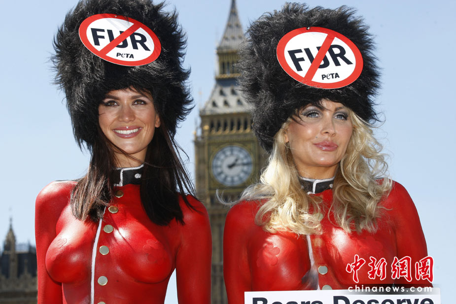 5月24日,倫敦,兩位打扮成英國女王守衛模樣的靚模在威斯敏斯特大橋上抗議女王守衛頭戴熊皮制作的帽子,倡議保護動物。