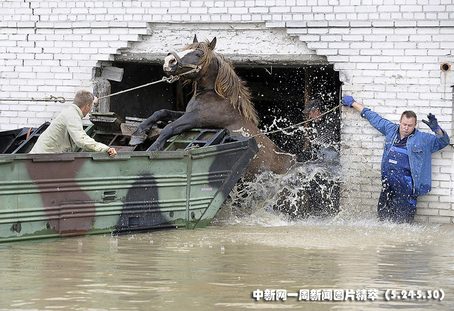 24日(周一),在波蘭Juliszew,農民正哄著一匹馬跳進兩棲車。由暴雨引發的洪水已在波蘭造成至少15人喪生。