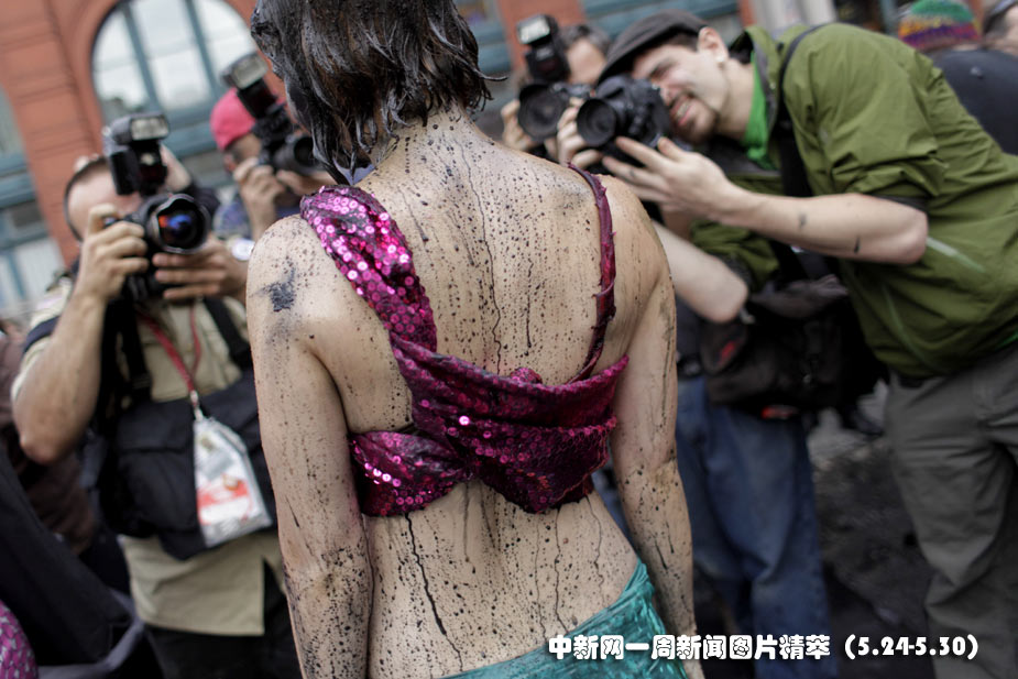 28日(周五),美國環保主義者在紐約曼哈頓的一家加油站前,身上涂灑黑色顏料,以此抗議墨西哥灣原油不斷泄露。