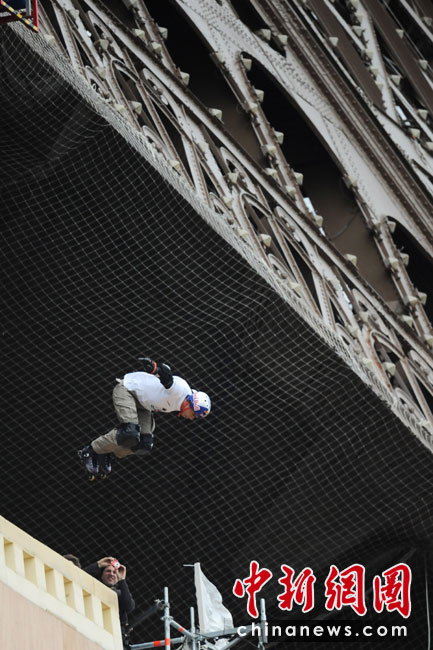 5月29日,法國(guó)巴黎,法國(guó)極限直排輪冠軍克里斯(Taig Khris)從法國(guó)艾菲爾鐵塔跳下,創(chuàng)下世界新自由落體紀(jì)錄。