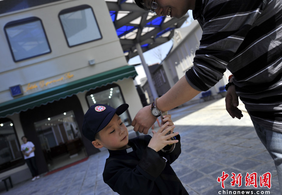 圖為“小警察”在逮捕“罪犯”。 中新網記者 王紅綱 攝
