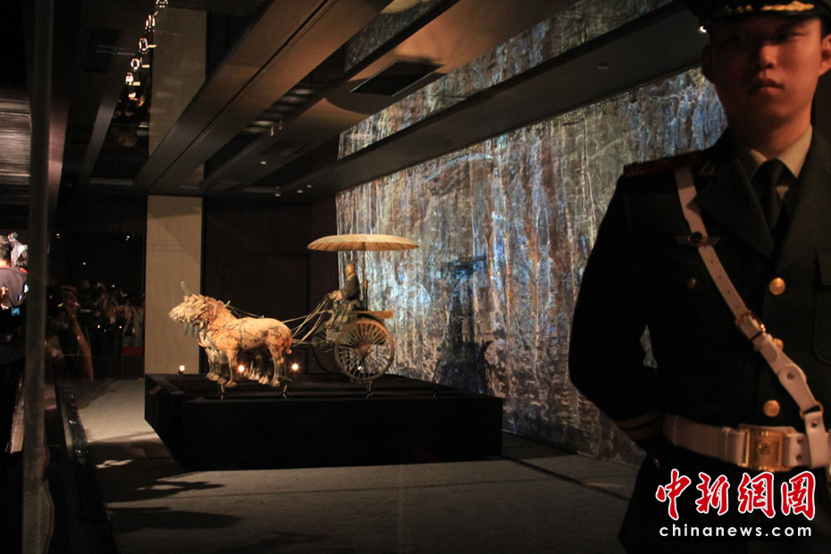 6月1日,秦始皇帝陵出土的“一號銅車馬”亮相世博會中國國家館,這是它出土30年以來第一次“駛出”陜西。這件國寶級文物在地下歷經了2200多個春秋,于1980年出土,通體彩繪,為雙輪,單轅,駟馬系駕,總重約1061公斤。銅車馬共由3500多個零件組成,除一些金、銀飾件外,其余全部為青銅鑄件。中新社記者 殷春永 攝