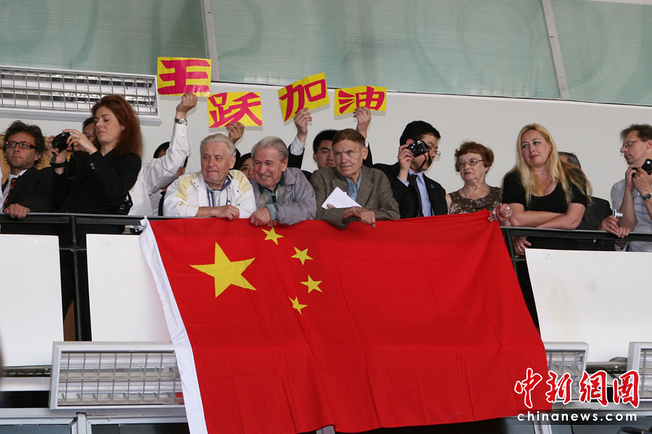 當地時間6月3日14時,“火星-500”實驗艙最后一道艙門關閉,人類歷史上首次模擬火星載人航天飛行試驗就此拉開帷幕。中國參試項目團隊現場為王躍加油。中新社記者 田冰 攝