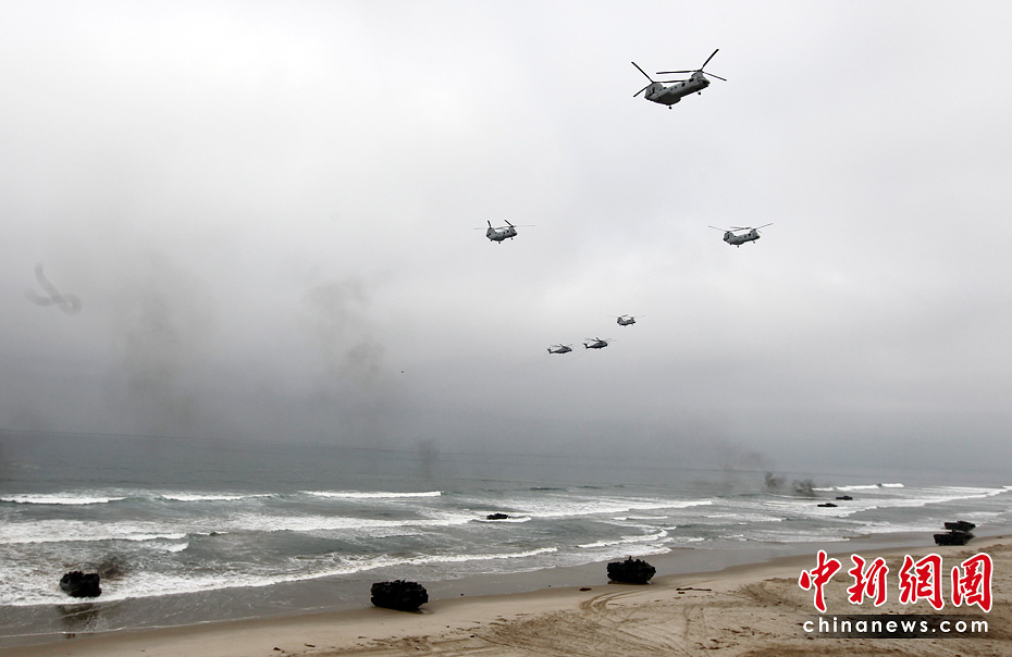 當(dāng)?shù)貢r間6月4日,約5000名水兵和陸戰(zhàn)隊員在美國加利福尼亞州舉行了代號為“黎明突擊”的搶灘登陸軍事演習(xí)。圖片來源:中國新聞網(wǎng)