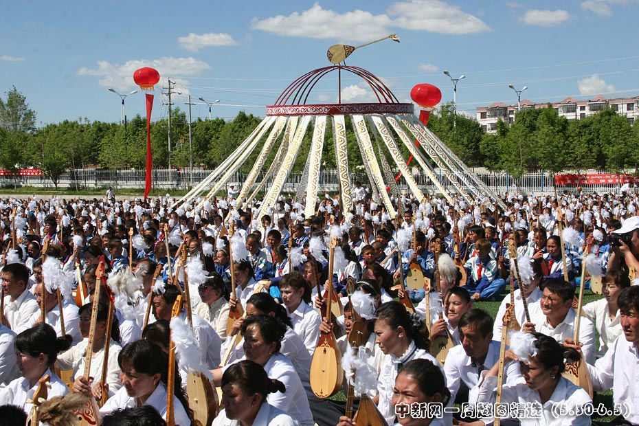 5月30日,新疆托里縣28個民族10495人共同參加冬不拉樂器表演,創下上海吉尼斯世界紀錄。萬人同奏的哈薩克族樂曲名為《凱乃斯》,漢語意為“和諧”。圖片來源:中國新聞網>>點擊觀看詳細內容