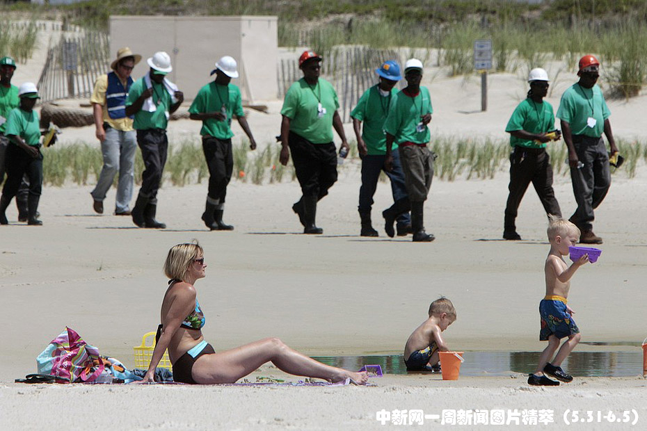 周二(1日),美國阿拉巴馬州海岸,人們在海邊曬太陽,石油工人在后面走過。墨西哥灣漏油事件已經(jīng)開始影響到該地區(qū)的旅游。