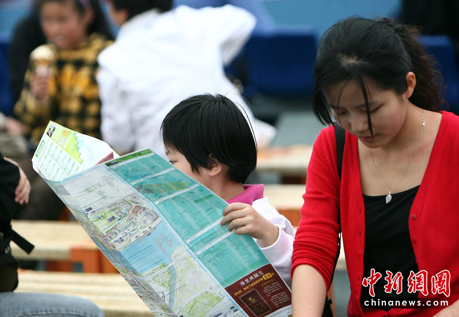 截至6月5日19點30分,上海世博會累計參觀者已超過1000萬人次。據悉,上海世博會的規劃用地為5.28平方公里,約242個國家和國際組織參展分布在浦東和浦西兩大區域。要想在這么大的地方找到自己想去的地方,那么世博地圖就是必須的裝備。圖為上海世博園內游客正在地圖上尋找自己要去的地方。中新社記者 杜洋 攝