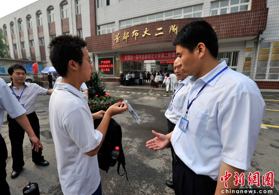 2010年全國高考6月7日日拉開大幕,957萬考生走進考場。由于報名人數減少,而招生計劃增加,教育部預計今年全國高考平均錄取率將會增加近7%。圖為首都師范大學第二附屬中學考點。中新網記者 金碩 攝