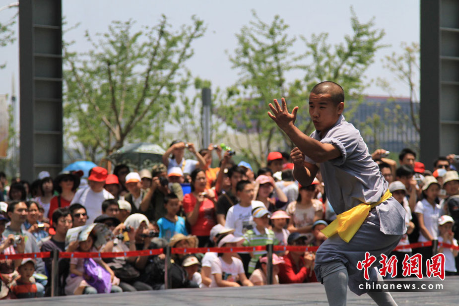 自5月1日開始,上海世博園D片區(qū)綜藝廣場(chǎng)每天都有少林寺功夫展演,受到世博參觀者的熱捧。中新社記者 殷春永攝